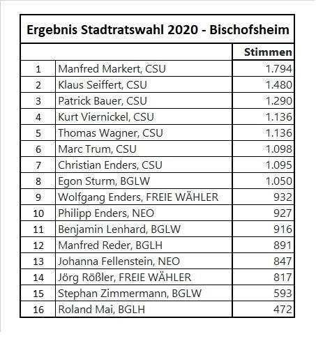 Bei der Stadtratswahl am 15. März 2020 erzielte ich ein für mich sehr erfreuliches Ergebnis. Mit über 21% vor dem zweit- und über 40% vor dem drittplazierten wählten mich die Bischofsheimer Bürger zum Stadtrat